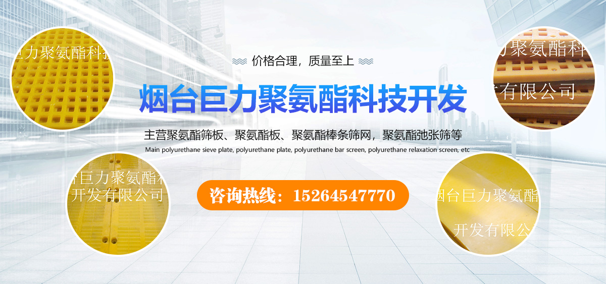 煙臺巨力聚氨(an)(an)酯科技(ji)開發有(you)限公司主營聚氨(an)(an)酯篩(shai)板(ban)、聚氨(an)(an)酯篩(shai)網(wang)、聚氨(an)(an)酯板(ban)、聚氨(an)(an)酯棒條篩(shai)網(wang),聚氨(an)(an)酯弛張篩(shai)等。我們的宗旨是講信譽,重合同,價格(ge)合理,質量(liang)至上(shang),交貨(huo)及時。